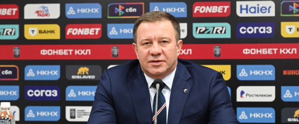Neftekhimik Head Coach Oleg Leontyev speaks with the media after a following 1–2 loss against Severstal.