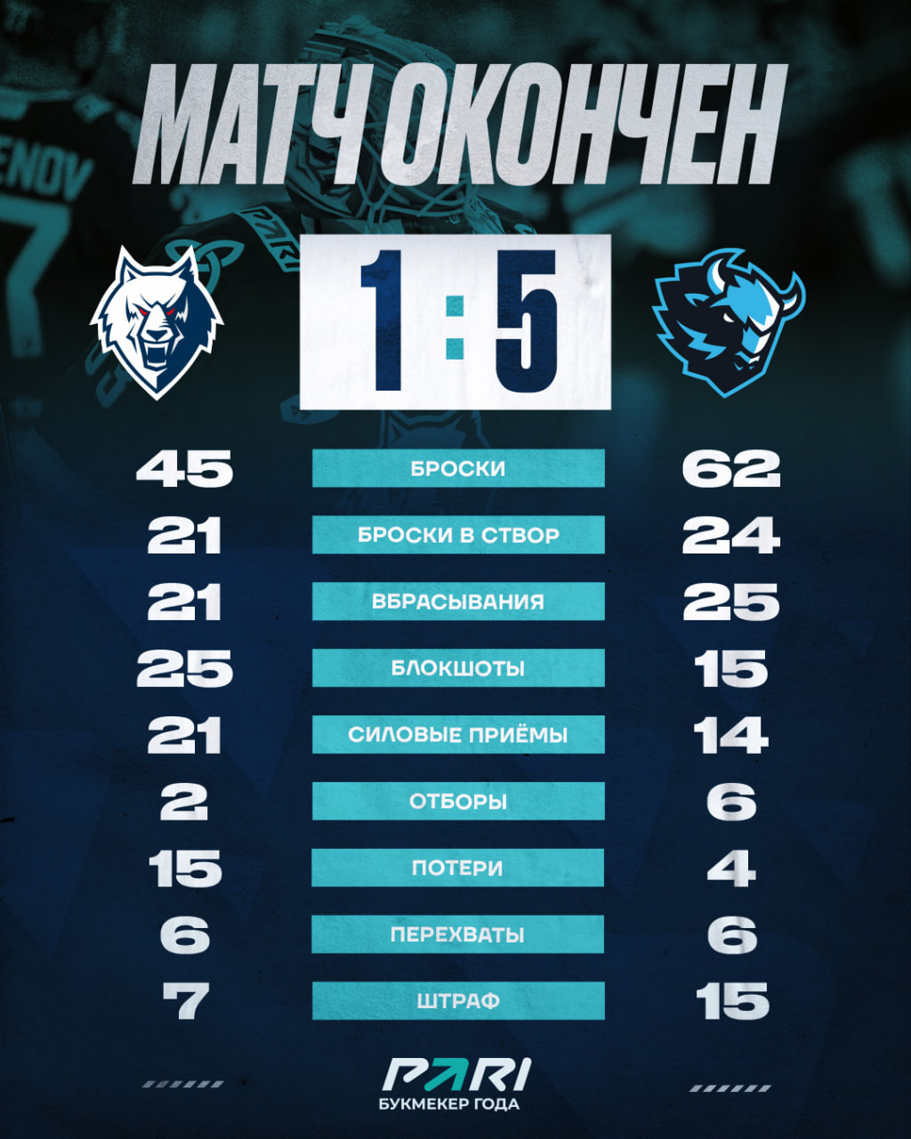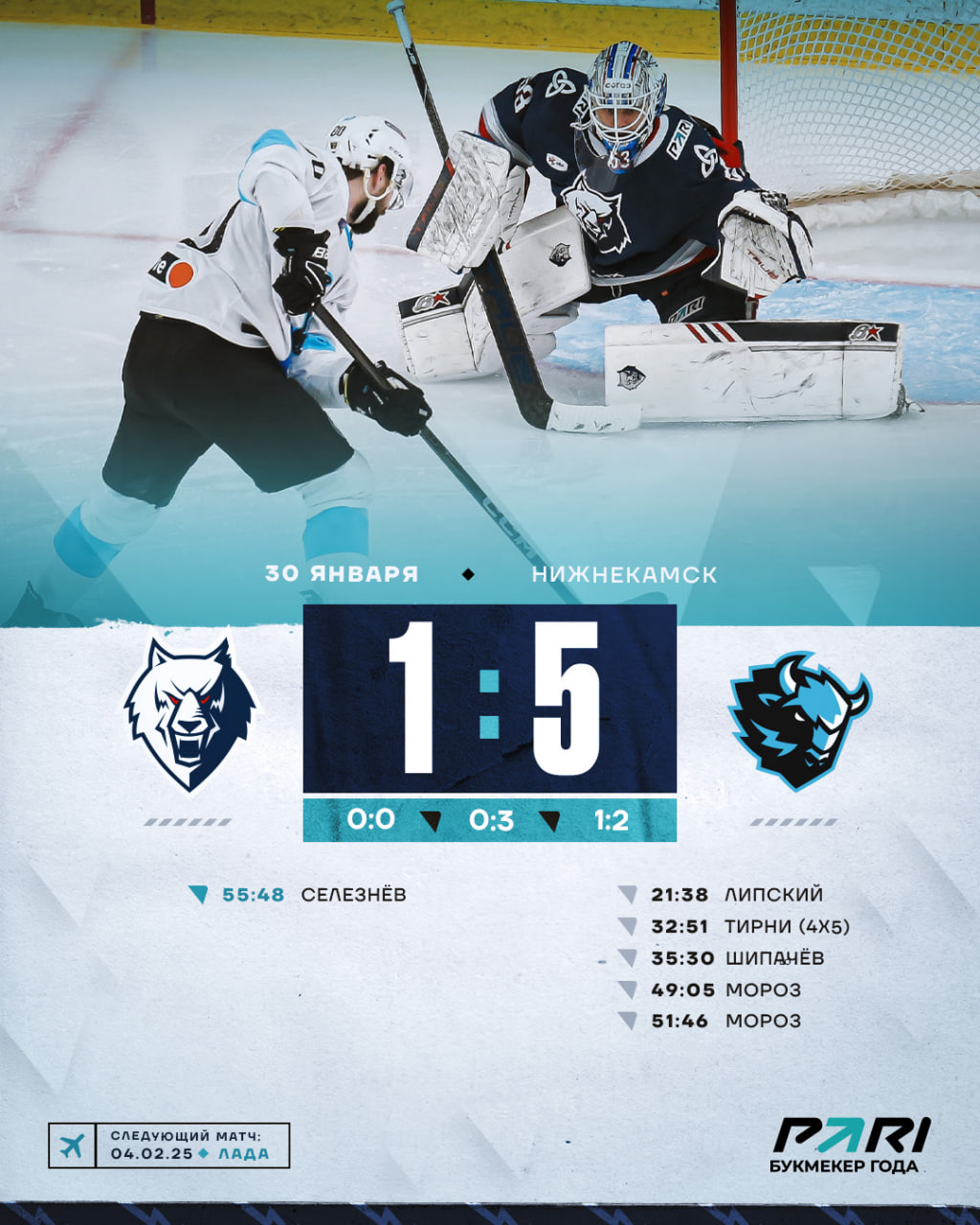 В третьем периоде хозяева площадки попытались спасти игру, но у нашей команды толком ничего не получалось. Вновь хромала реализация моментов. А вот гости еще два раза огорчили Долганова. Только в концовке матча «волкам» удалось размочить счет. Отличился Селезнёв.