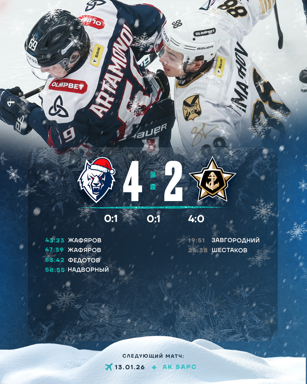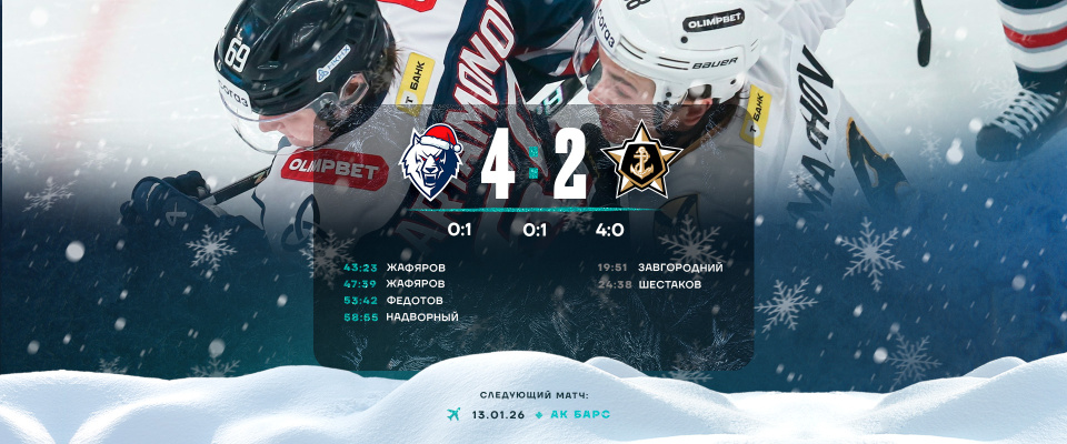 В заключительном периоде «волкам» удалось переломить игру. Надо отметить проявленный нашими игроками характер, волю. Вовремя распечатал ворота «Адмирала» Дамир Жафяров, который отличился с нулевого угла. Этот гол заметно вдохновил подопечных Игоря Гришина.