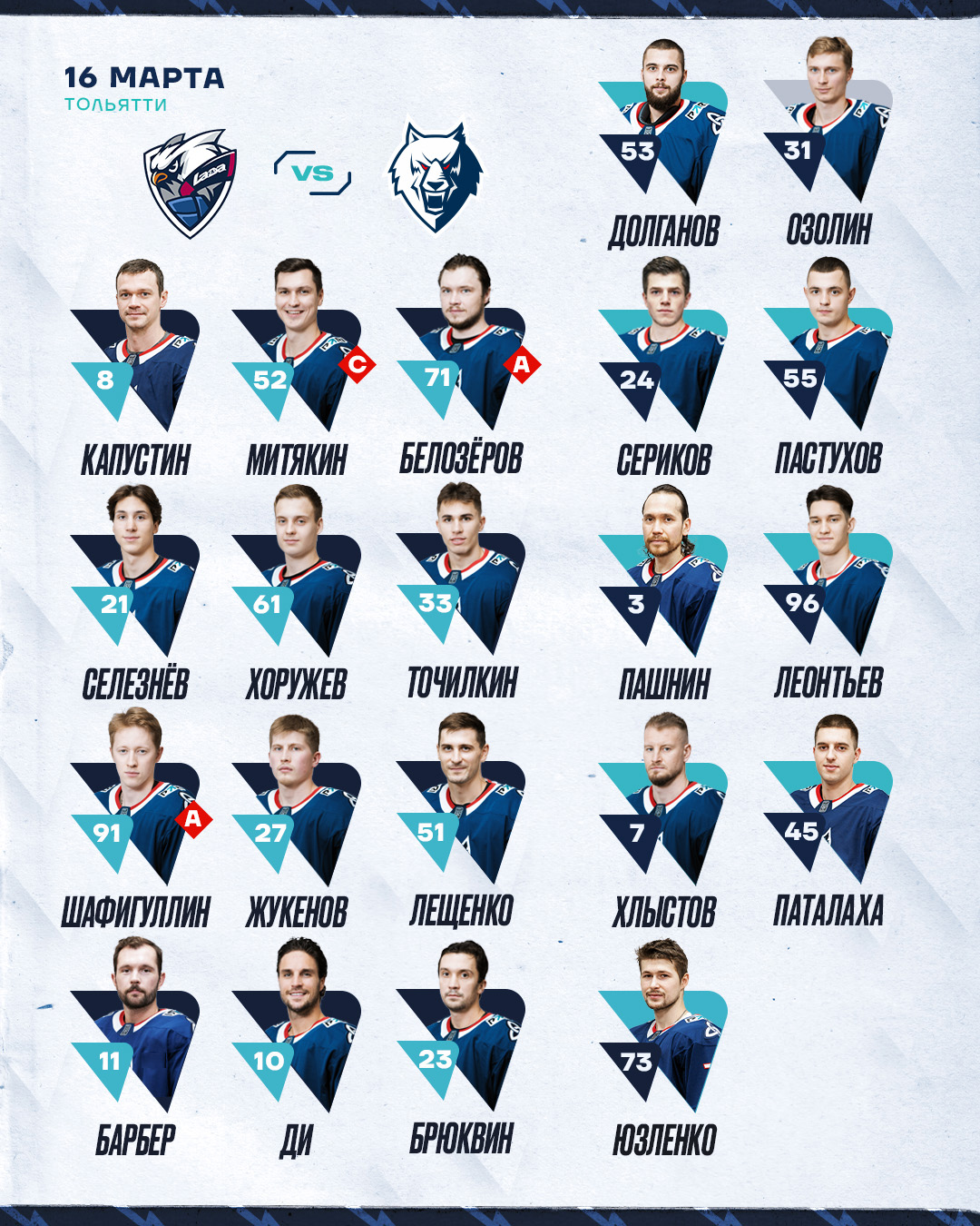 Тренерский штаб Олега Леонтьева назвал состав «Нефтехимика» на гостевую игру FONBET Чемпионата КХЛ сезона 2024/2025 с тольяттинской «Ладой».