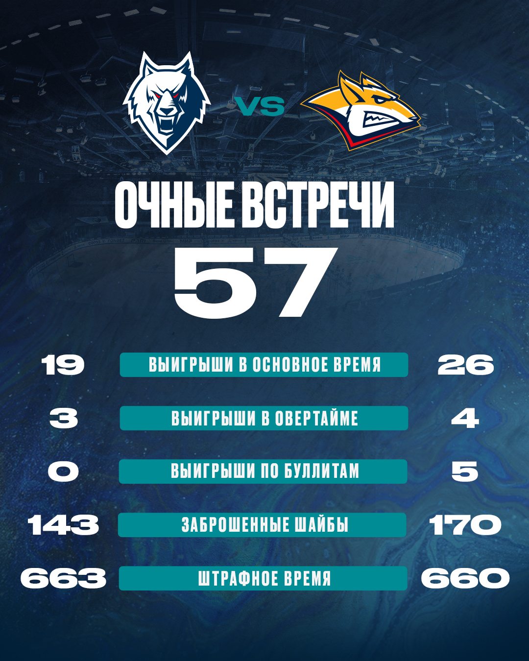 Ниже приводим статистику очных встреч команд в истории КХЛ.