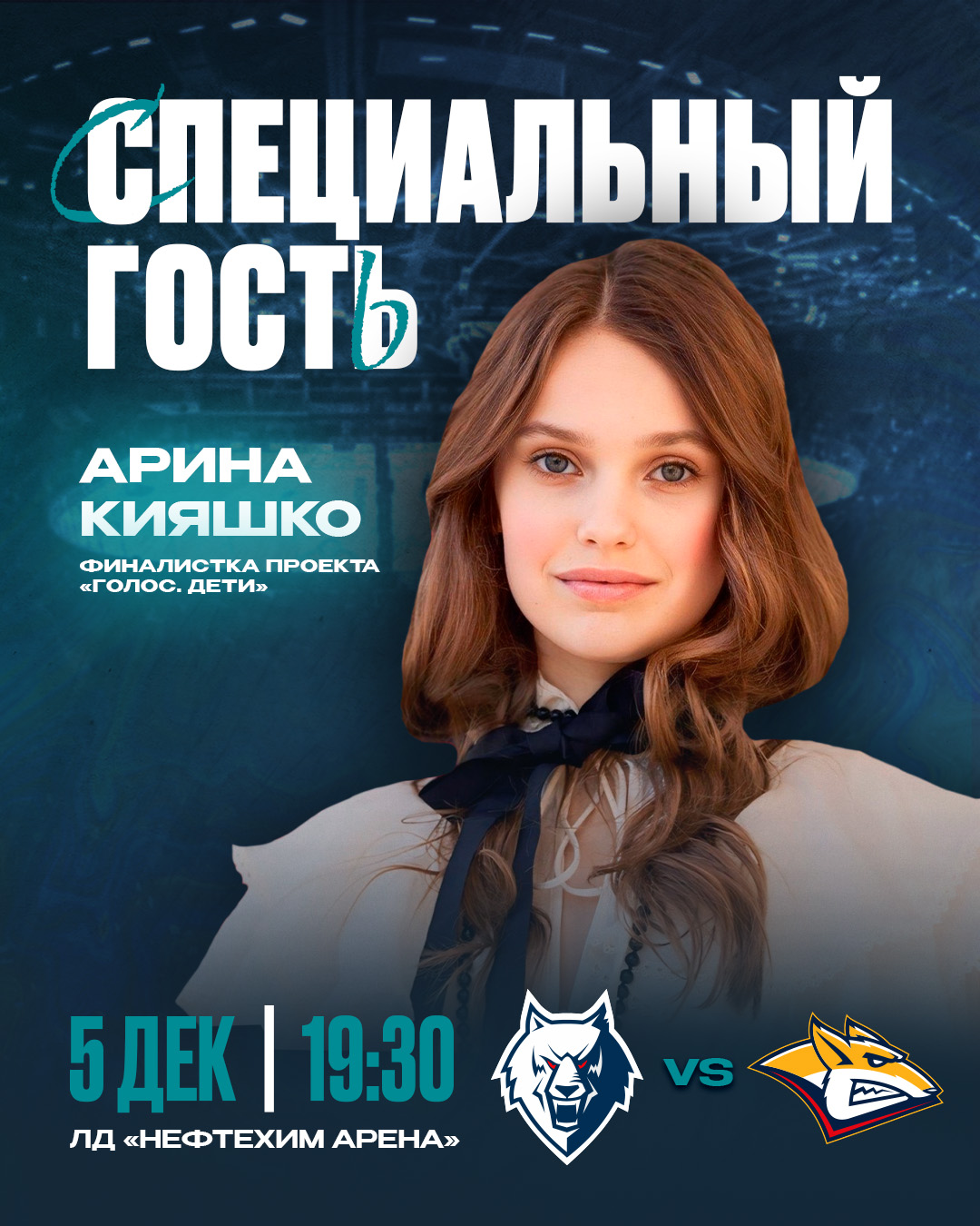 Что касается культурной программы предстоящего хоккейного вечера, то тут всех болельщиков ждет приятный сюрприз! Специальным гостем игры станет финалистка очередного сезона шоу «Голос. Дети» Арина Кияшко. Юная нижнекамская вокалистка для всех болельщиков проведет живое исполнение. Также у нас запланировано множество других активностей, розыгрышей и конкурсов. Ждем всех на трибунах «Нефтехим Арены»!