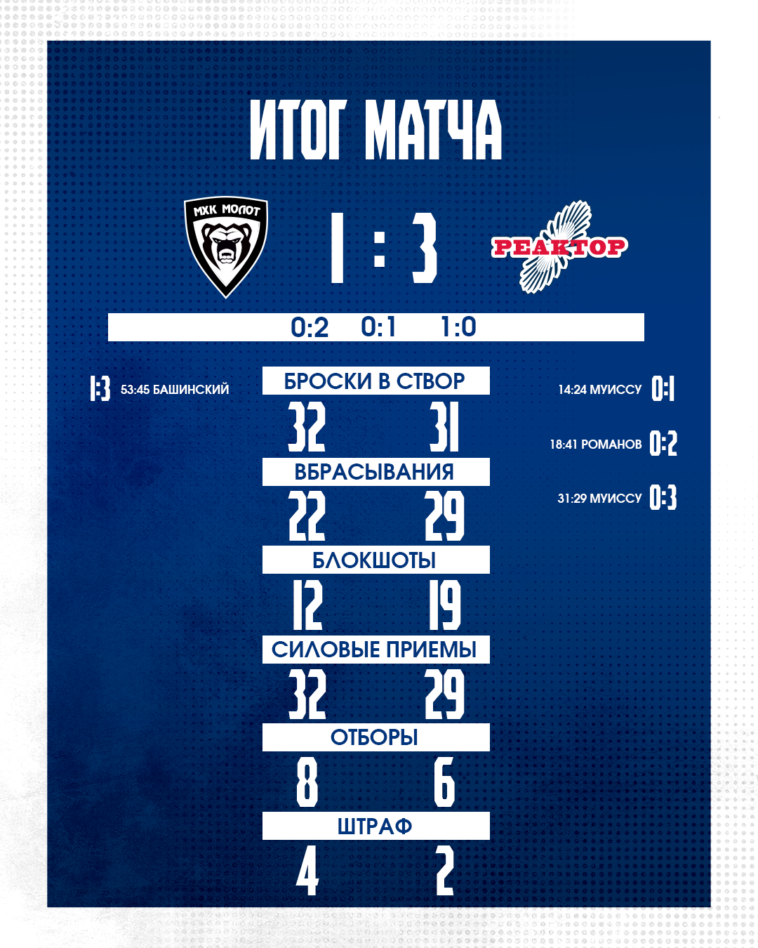 Во вторые 20 минут пермяки выравняли характер игры, много и опасно атаковали, но забили снова «реакторщики». Муиссу забросил свою вторую в этот вечер.