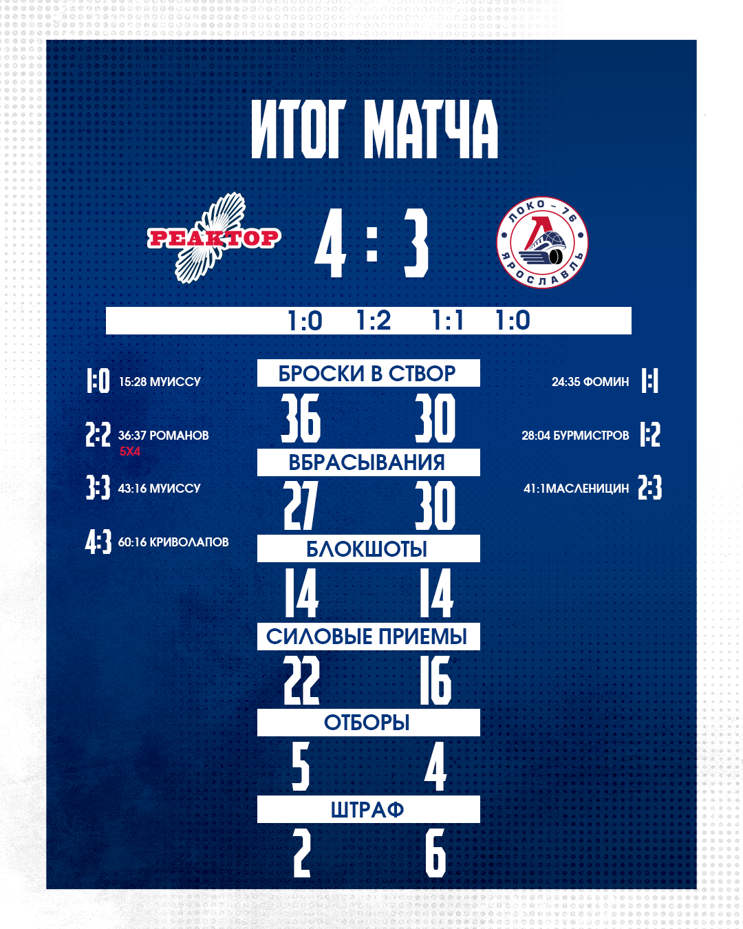 На «Нефтехим Арене» завершился поединок между «Реактором» и «Локо-76». Победу в матче со счетом 4:3 в дополнительное время одержали «реакторщики».