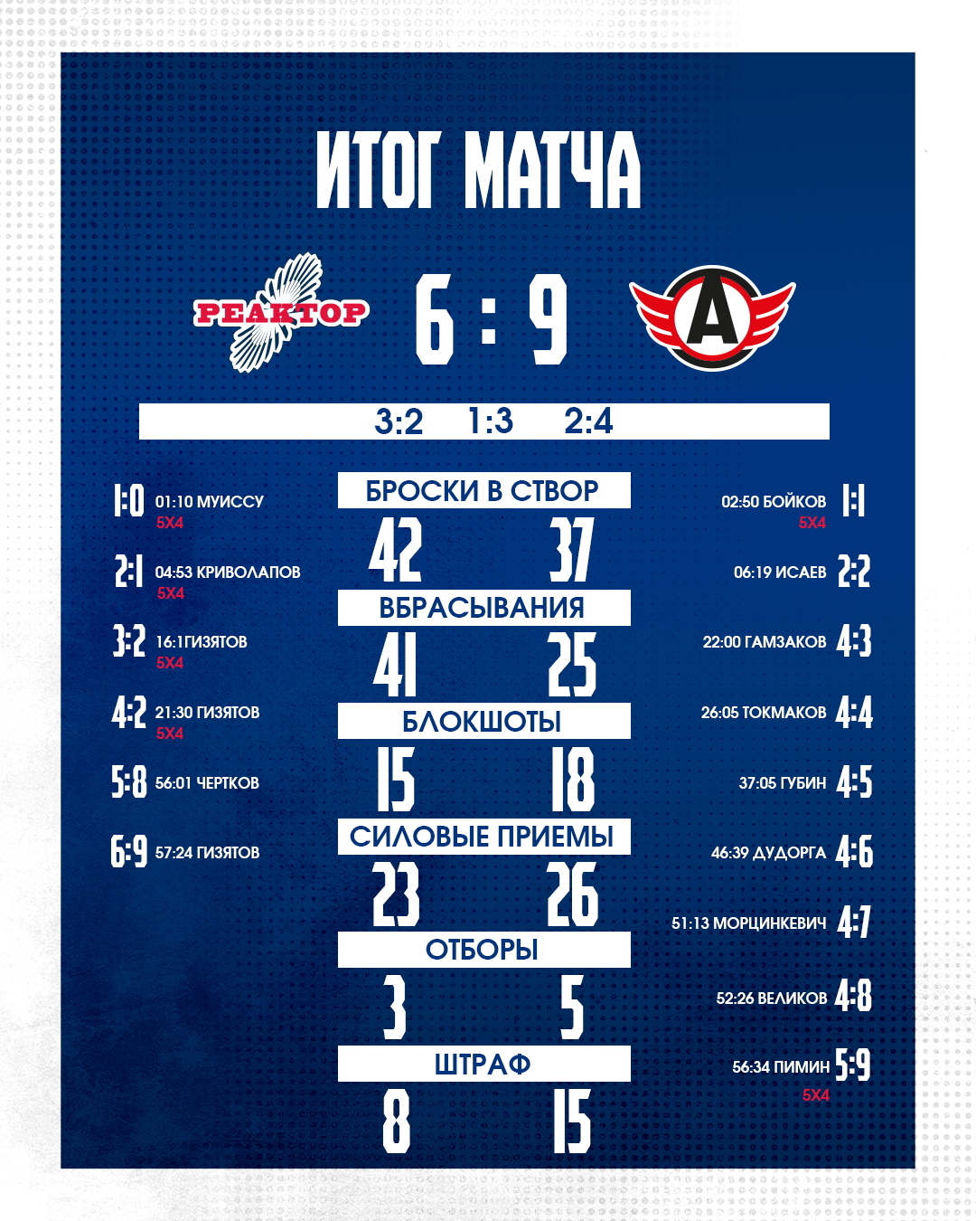 В и без того результативном поединке самым богатым на голы получился заключительный период. К сожалению для наших болельщиков, забивали в основном игроки «Авто». Влад Чертков смог отличиться только при счете 4:8, и сделал он это в меньшинстве. Однако и на этом все не закончилось. До сирены команды успели еще по разу отличиться. У нашей «молодежки» это сделал Гизятов, у которого сегодня хет-трик.