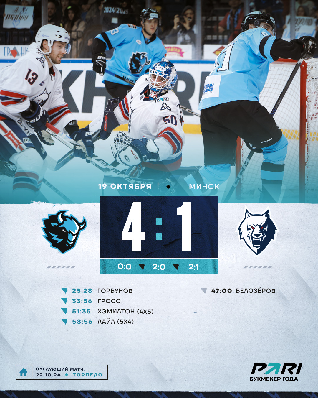 На 48-й минуте Андрей Белозёров удачно добил шайбу, сократив отставание до минимума. «Волки» продолжили оказывать давление на ворота Тихомирова. Но шайба упорно не шла в ворота. Появилась отличная возможность сравнять счёт, когда динамовец был удален. Однако в данном формате отличились хозяева… 3:1 Увы, времени отыгрываться уже не оставалось...