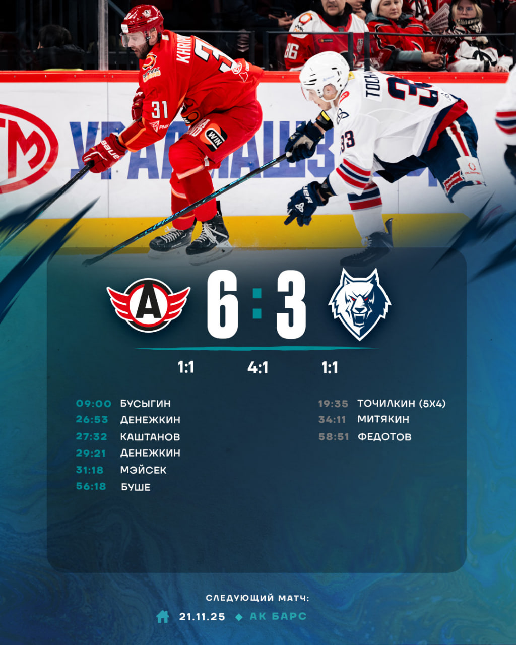 В третьем периоде «Автомобилист» сыграл строго по счету и в этом преуспел. Более того, сумел забросить еще одну шайбу в наши ворота, на что мы ответили третьим голом в исполнении Максима Федотова.