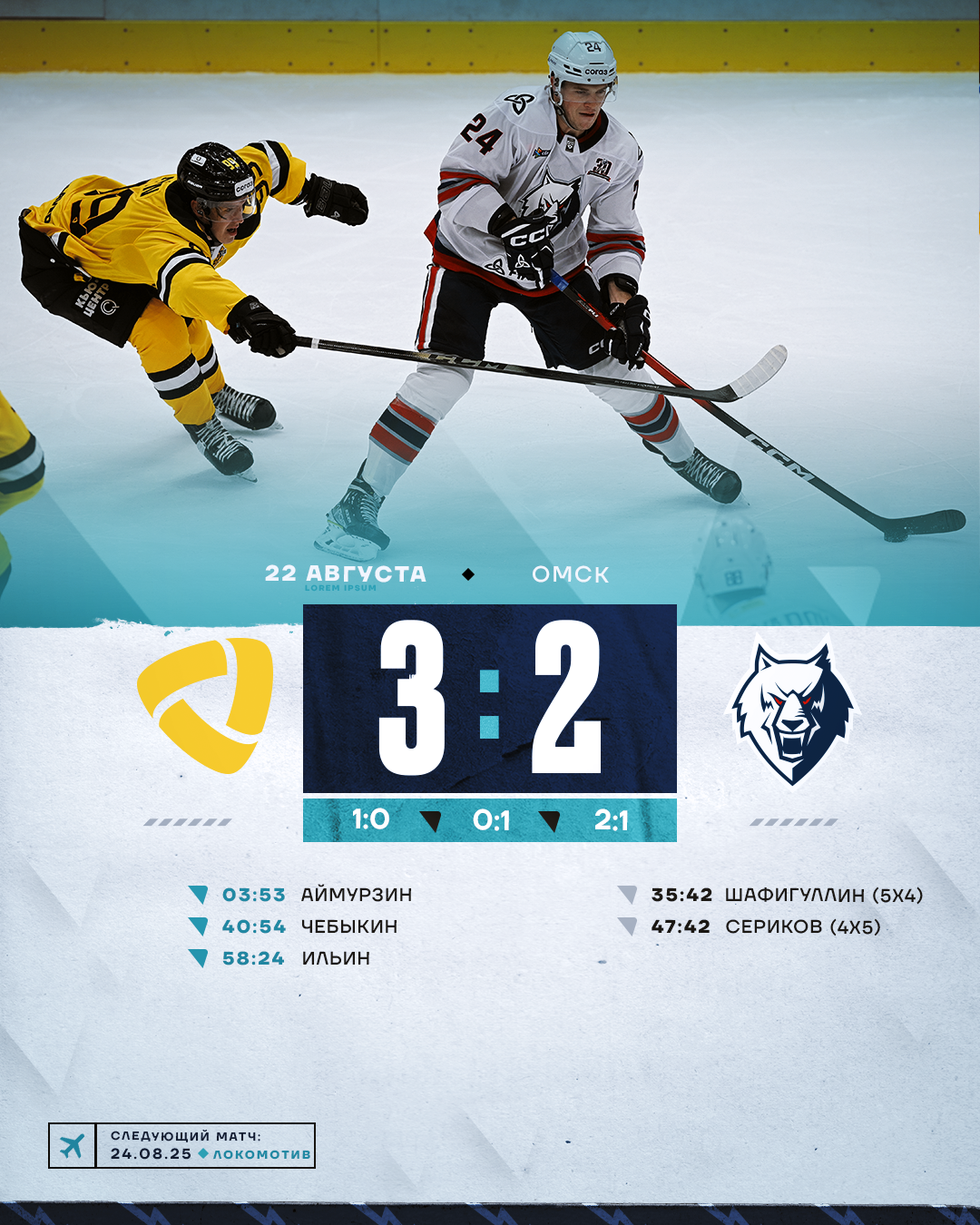 В начале третьего периода наша команда вновь пропустила. На отбитую Озолиным шайбу откликнулся Чебыкин. «Волки» довольно скоро сравняли счет, причем, играя в меньшинстве. После ювелирного по точности передачи Шафигуллина дальний угол ворот поразил Сериков. Тут же наша команда могла забросить и третью шайбу. Вновь голевой момент создал Булат. Однако выручил свою команду Скотников.