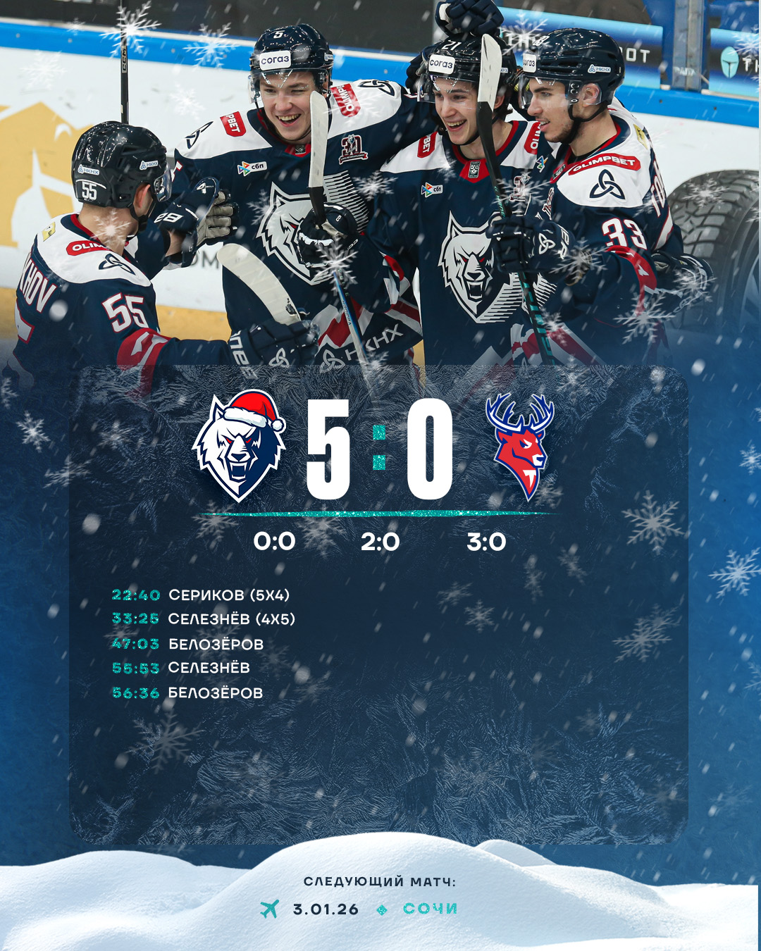 «Волки» счет в матче открыли в начале второго периода, когда у гостей штраф отбывал Владислав Фирстов. От синей линии бросил Артём Сериков, и после касания клюшки шайба оказалась в воротах гостей. Сначала по арене объявили, что шайбу подправил Евгений Митякин, но через некоторое время судьи внесли поправку – посчитали, что все-таки гол на счету Андрея Белозёрова. Момент с взятием ворот настолько оказался сложным, что только с третьей попытки определили автора заброшенной шайбы. Ее записали на Артёма Серикова.