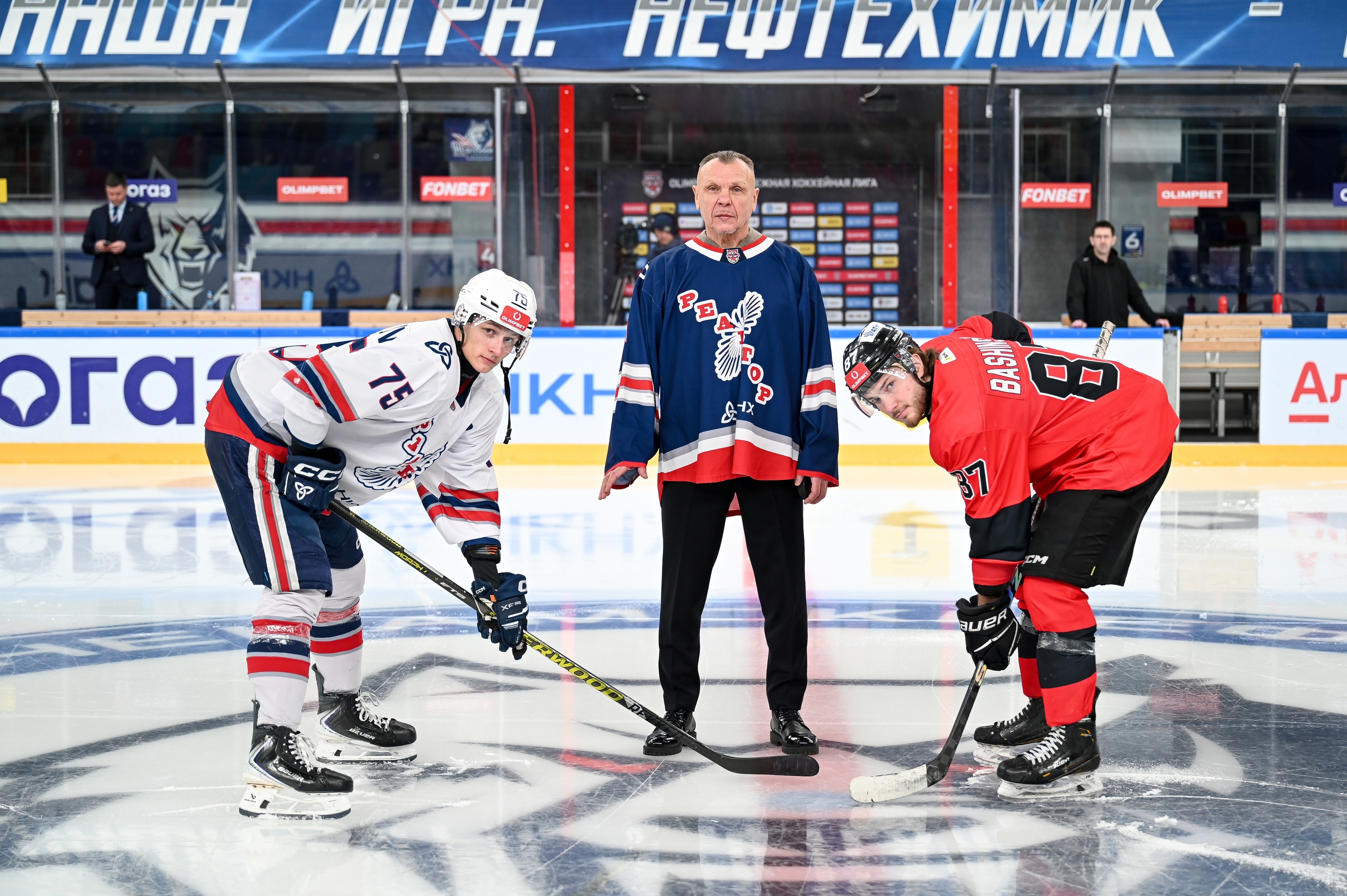 Перед матчем символическое вбрасывание произвёл Соколов Александр Юрьевич - тренер, который оставил неизгладимый след в истории нижнекамского хоккея. Александр Юрьевич на протяжении семи сезонов тренировал «Реактор», в 2017-м году выводил команду в финал.