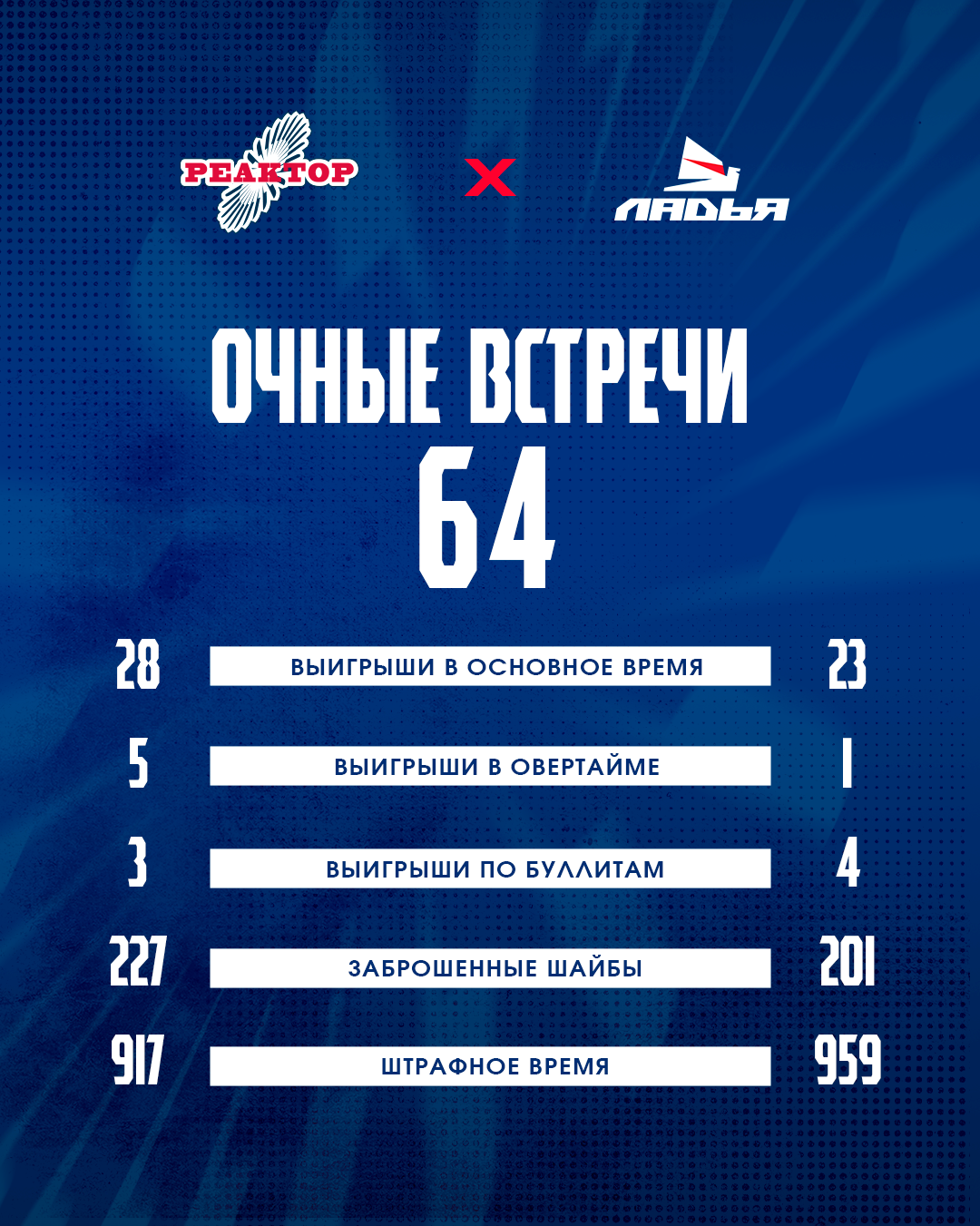 Всего команды встречались на льду 64 раза. По количеству побед лидирует «Реактор» - 36 против 28-ми.