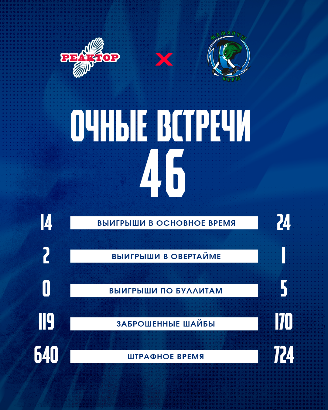 Сегодняшняя игра между командами станет 47-й. На счету югорчан 30 побед, а у «Реактора» 16 выигранных встреч.