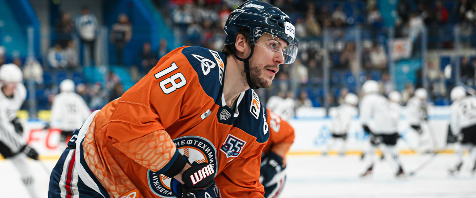Neftekhimik forward Alexander Dergachyov speaks with the media after a following 2–1 win over Traktor.