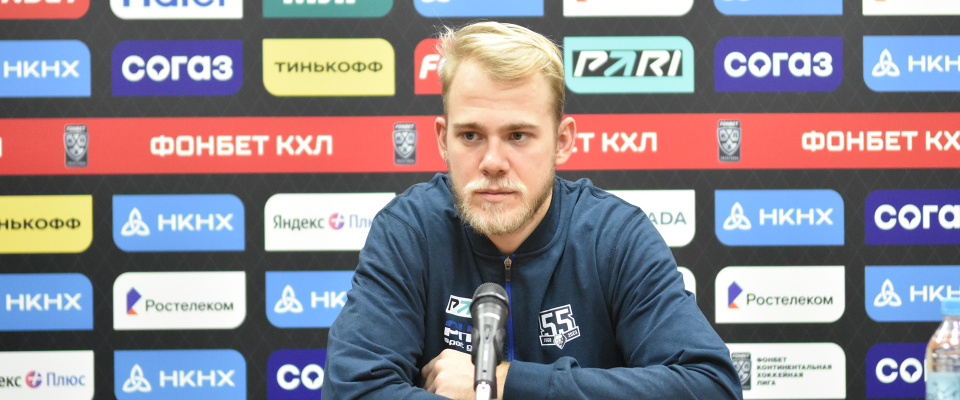 Neftekhimik forward Daniil Skorikov speaks with the media after a following 1–4 loss against Avangard.