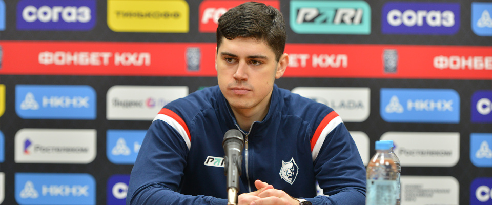 Neftekhimik forward Danila Popov speaks with the media after a following 4–3 win over Admiral.