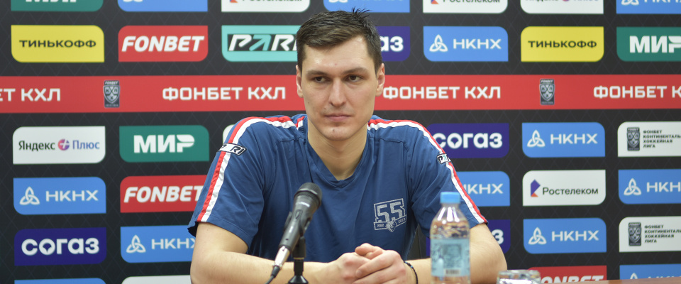 Neftekhimik forward Evgeny Mityakin speaks with the media after a following 3–2 win over Barys.