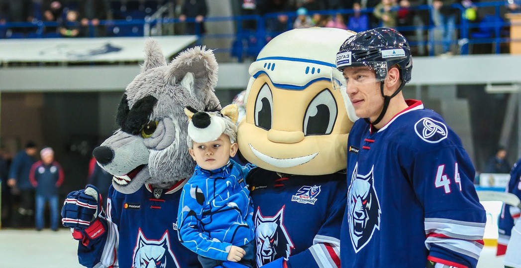 During our home games you can see children of different ages who cheering for "Neftekhimik". Tagir is one of the youngest fans. He wore his wolf hat for each game. We and Damir Sharipzyanov noticed him and gave him some present - Damir's hockey stick!