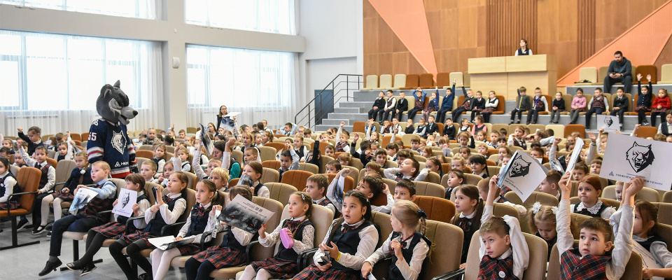 The little students tried to guess the names of the hockey equipment – gloves, helmet and shoulder pads. Young children high-fived the Wolf (Neftekhimik mascot), learned several chants and got invitation tickets to the next home game at the Neftekhim Arena.