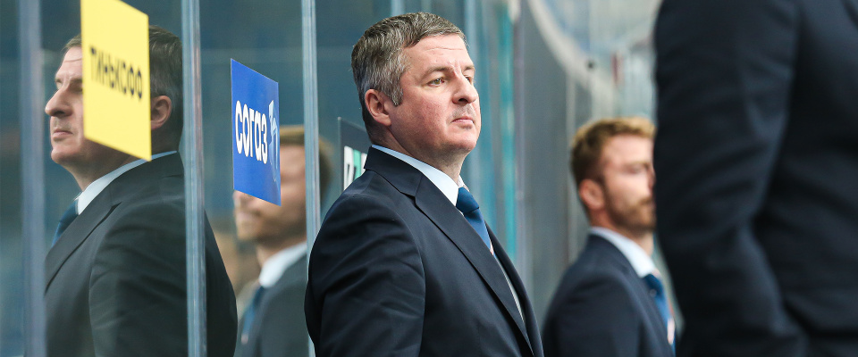 Reaktor head coach Igor Fyodorov speaks with the media after a following 0–4 loss against Kuznetskie Medvedi.