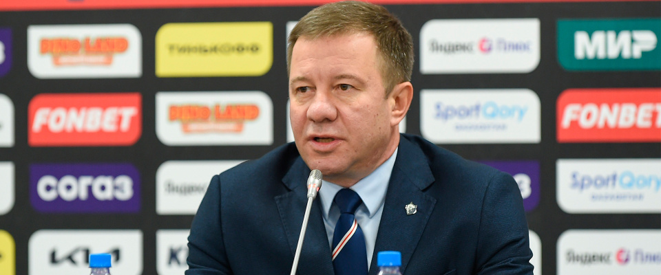 Neftekhimik head coach Oleg Leontyev speaks with the media after a following 4–2 loss against Amur.