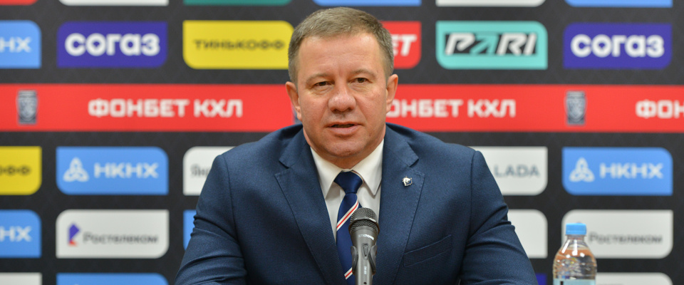 Neftekhimik head coach Oleg Leontyev speaks with the media after a following 4–3 win over Admiral.