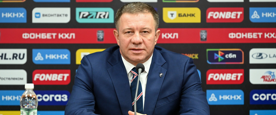 Neftekhimik Head Coach Oleg Leontyev speaks with the media after a following 2–6 loss against Traktor.