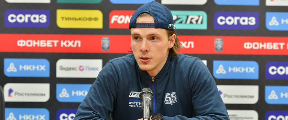 Neftekhimik defenseman Ruslan Petrishchev speaks with the media after a following 1–4 loss against Spartak.