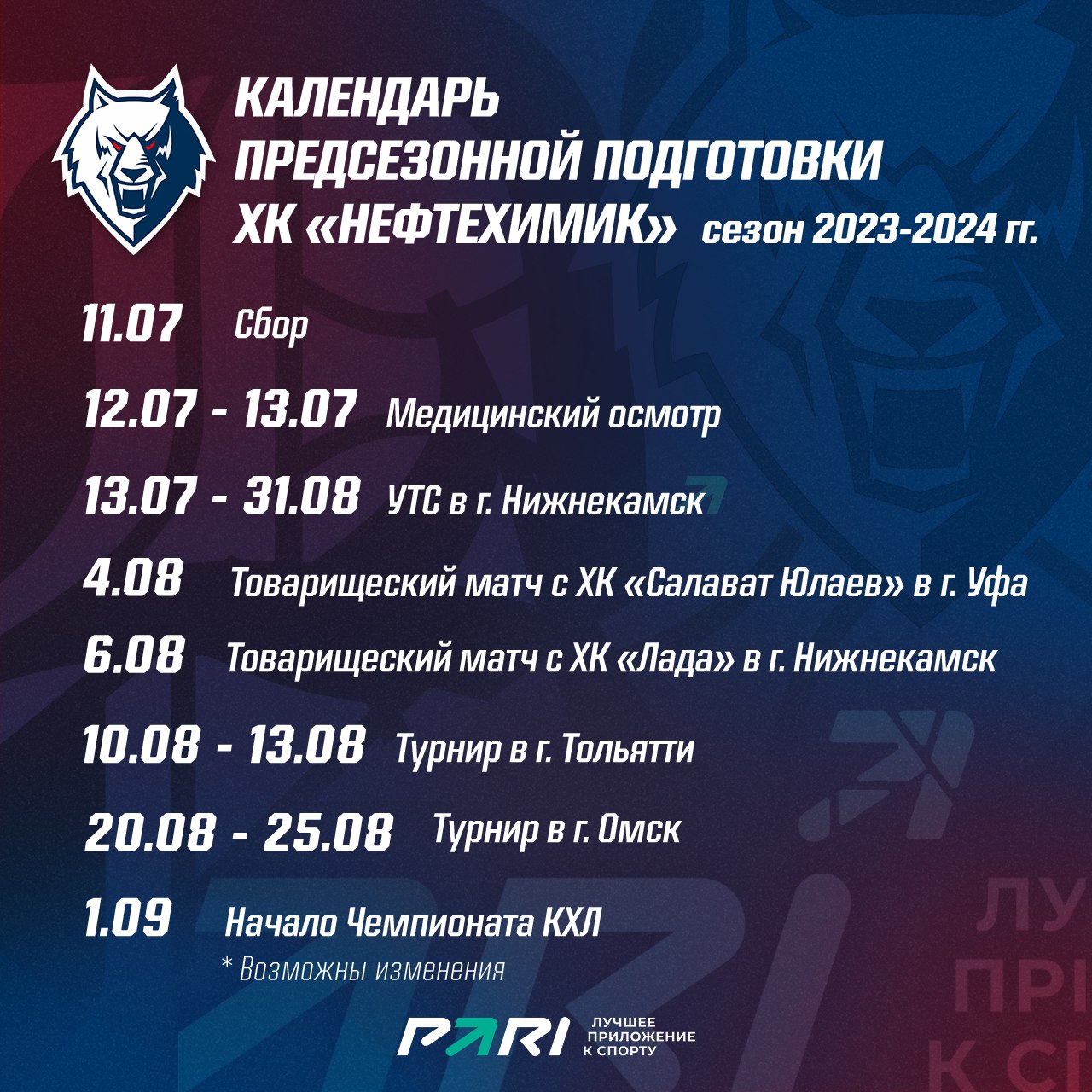 Календарь предсезонной подготовки ХК «Нефтехимик»
