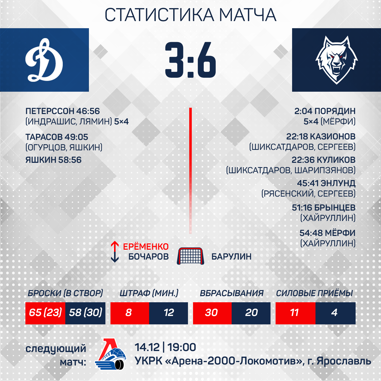 Павел Порядин открыл счет уже на третьей минуте игры, реализовав большинство. В самом начале второго периода в течении 16 секунд «волки» забросили две шайбы. Отличились Денис Казионов и Павел Куликов.Самые интересные события произошли в заключительном периоде. Команды сыграли в открытый хоккей и по три раза поразили ворота друг друга. У нас отличились Йонас Энлунд, Райан Мерфи и Александр Брынцев. 6:3 - десятая подряд победа «Нефтехимика»!