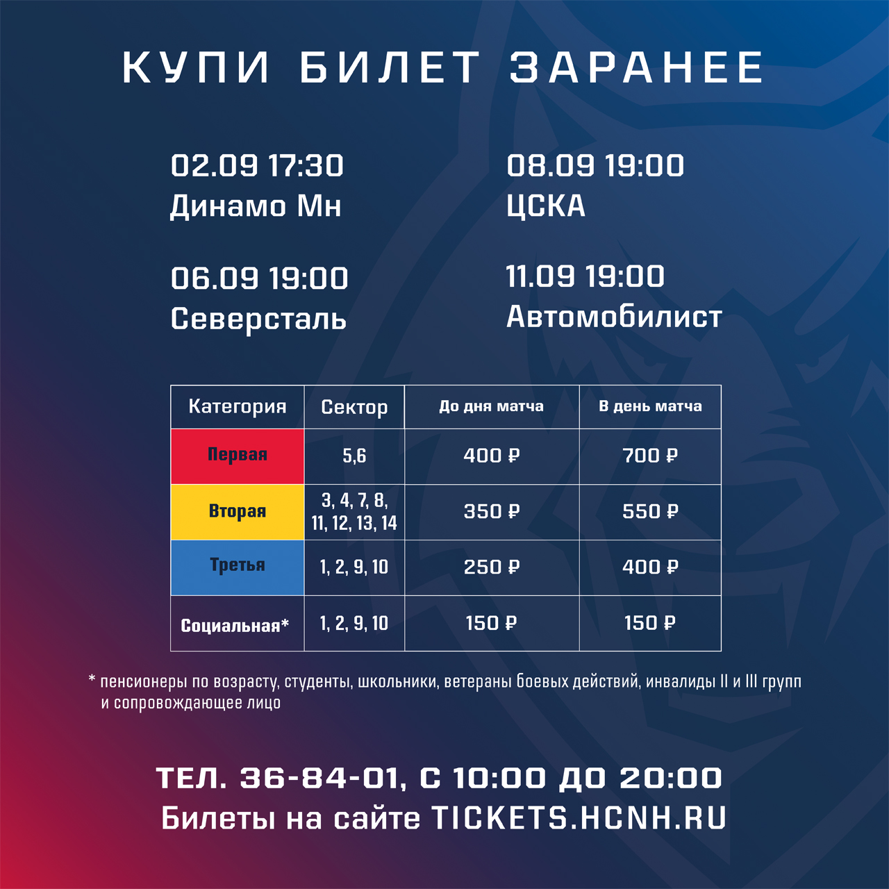 Дети до шести лет (без права занятия места), инвалиды 1 группы плюс сопровождающее лицо, ветераны Великой Отечественной войны на матчи проходят бесплатно.