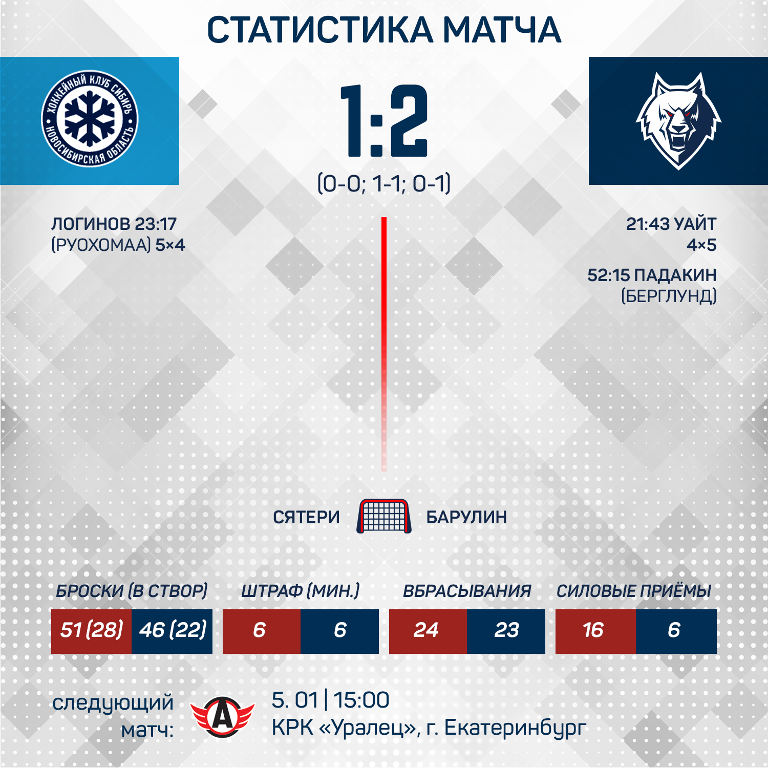 Первая шайба была забита в начале второго периода, когда Мэтт Уайт в меньшинстве убежал в сольный проход и поймал голкипера хозяев на ошибке. «Сибирь» быстро отыгралась, сравняв счет в большинстве.Исход матча решился в середине третьего периода, когда на отложенном штрафе Якоб Берглунд прострелил на Павла Падакина и тот точно переправил шайбу в ворота. 2:1 - очень важная победа в борьбе за выход в плей-офф.
