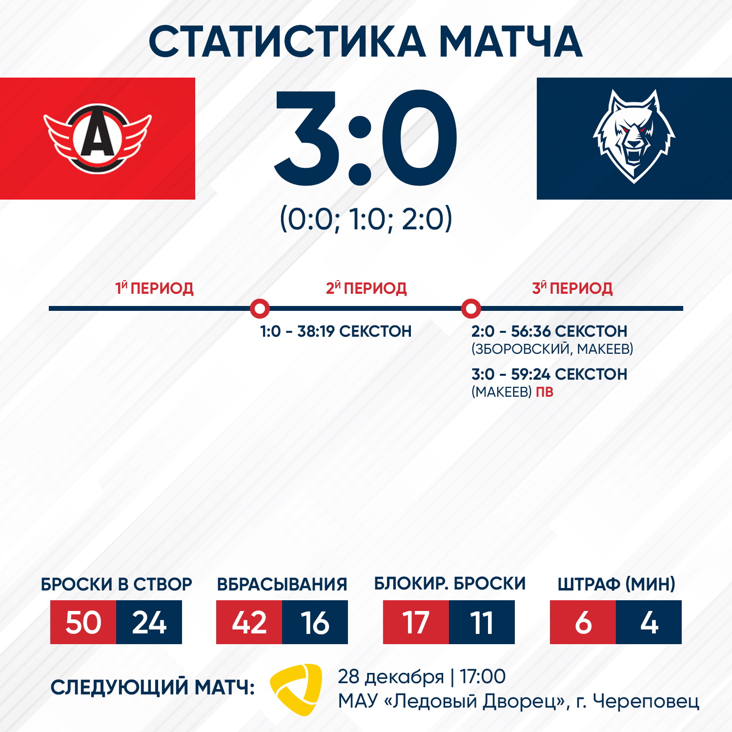 В этой игре первый в сезоне матч провел Федор Коротаев, а также в нашем составе дебютировал Никита Попугаев, который перешел из московского «Динамо».Забегая вперед можно сказать, что наш голкипер провел хороший поединок. Федор сделал 47 спасений после 49 бросков по его воротам. Третью шайбу хозяева забросили уже в пустые ворота.