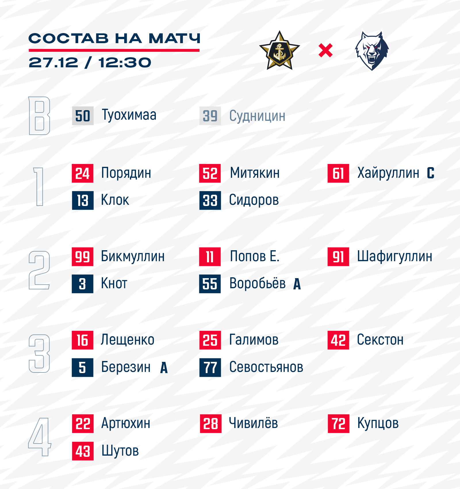 Стал известен состав нашей команды на гостевой матч регулярного чемпионата КХЛ с «Адмиралом».