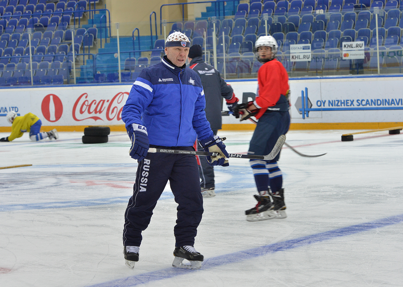 Сегодня он провел очередное занятие с группой спортивного совершенствования. На этот раз игроки команд с 2001 по 2004 г.р. ДЮСШ «Нефтехимик» в течение одного часа и 15 минут под руководством опытного наставника провели интенсивную тренировку. Мальчишки, разбившись на несколько групп, выполняли различные упражнения. На льду также работали и тренеры ДЮСШ Роман Вафин, Ильнар Нургалиев и Рамиль Нугуманов. Сам Александр Юрьевич не только осуществлял общее руководство занятием, но активно и охотно включался в процесс работы, подсказывал, показывал, как нужно выполнять то или иное упражнение. Было видно, что ребята работают с большим желанием.