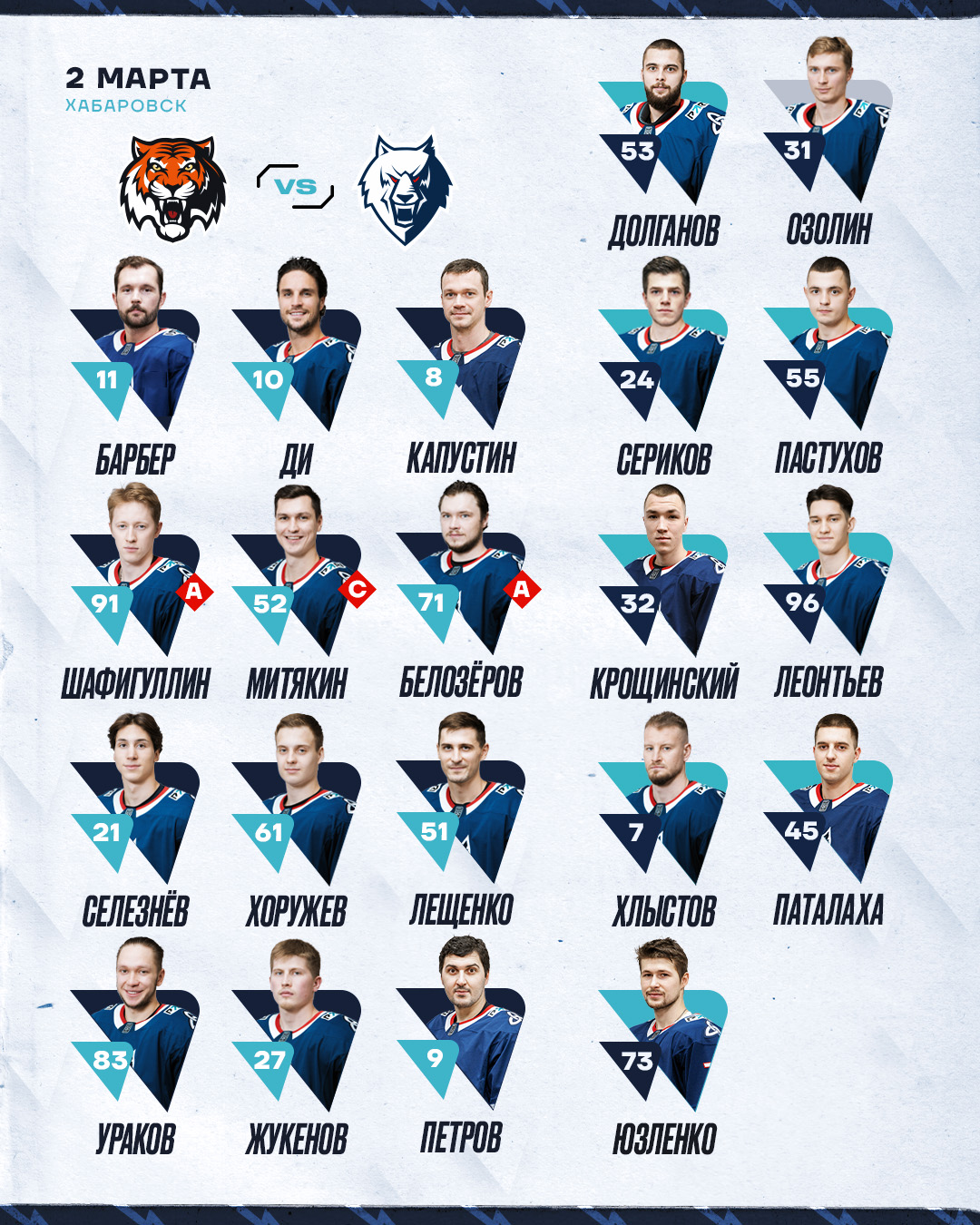 Тренерский штаб Олега Леонтьева назвал состав «Нефтехимика» на гостевую игру FONBET Чемпионата КХЛ сезона 2024/2025 с хабаровским «Амуром».