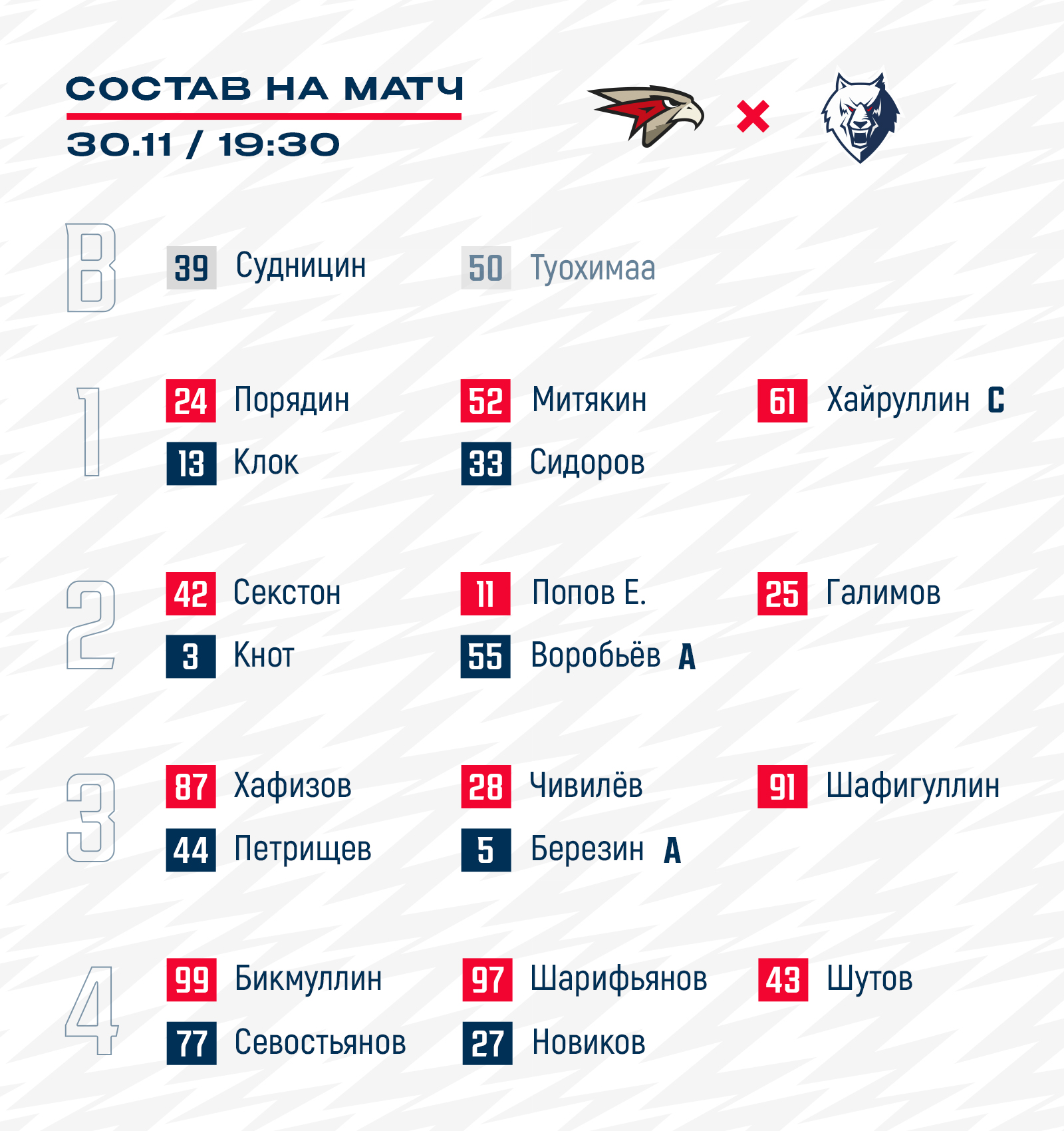 Стал известен состав нашей команды на гостевой матч регулярного чемпионата КХЛ с омским «Авангардом».