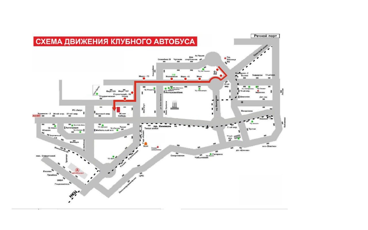 Автобус начнет свое движение по маршруту в 18.00 от детской поликлиники через проспекта Мира и до «Нефтехим Арены».Подробная схема маршрута представлена на картинке