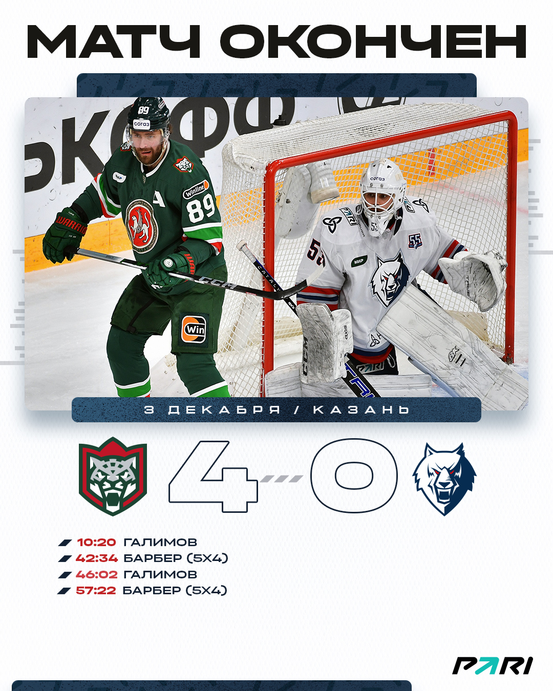 В первых двух периодах шла равная борьба, даже с нашим небольшим преимуществом, но в счете вели хозяева.К сожалению, снова для нас трудно сложился третий период. Казанцы дважды реализовали большинство и один раз забросили в равных составах. 0:4 – терпим довольно чувствительное поражение.