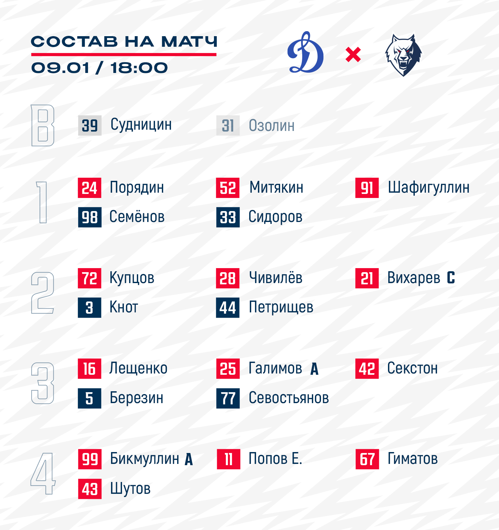 Стал известен состав нашей команды на гостевой матч регулярного чемпионата КХЛ с московским «Динамо».