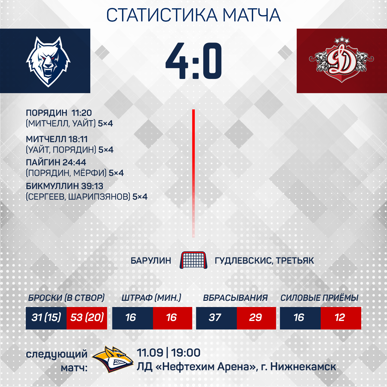«Нефтехимик» провел на своем льду первую игру. «Волки» встречались с рижским «Динамо» и добились уверенной победы со счетом 4:0.