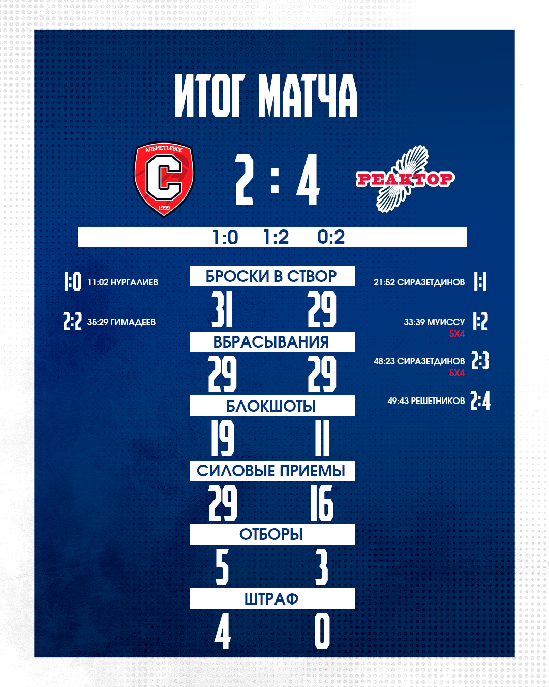Случилось это не в первом периоде. В нем удача однажды улыбнулась хозяевам льда. А вот во вторые 20 минут «Реактор» наконец смог забить, прервав свою «сухую» серию в атаке, которая длилась более семи периодов. Отличиться смогли Ильяс Сиразетдинов и Жоэ Кристоф Муиссу в большинстве. Однако уйти на второй перерыв, ведя в счете, не удалось. В концовке альметьевцы подравняли цифры на табло.Исход матча решился в середине заключительного периода, когда Сиразетдинов и Кондрат Решетников за минуту с небольшим забросили две шайбы.