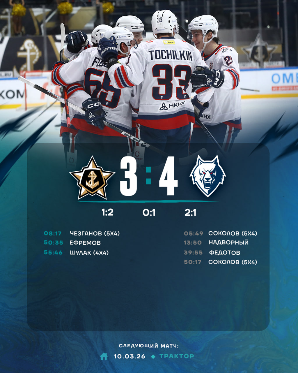 Однако после этого сразу в первой же смене «моряки» сократили разрыв в счете. До конца третьего периода оставалось еще 9 с лишним минут игрового времени. Чувствовалось, что градус напряжения нарастает. 5-минутное удаление Дмитрия Тимашова несколько расслабило наших игроков, и концовка матча выдалась нервной, но к чести команды, она сумела закончить выездную серию победой.