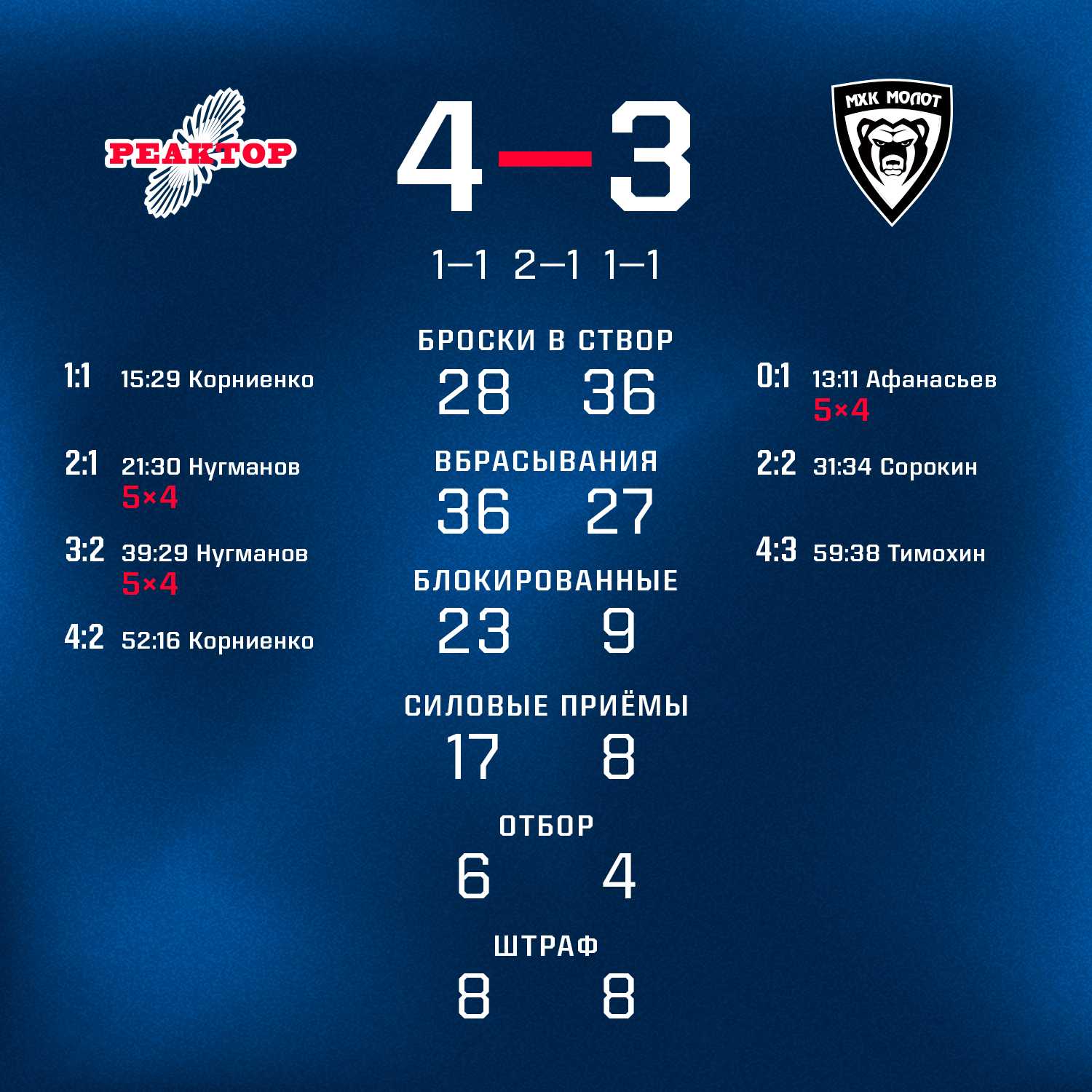 Дубли Нугманова и Корниенко помогли «Реактору» обыграть МХК «Молот»