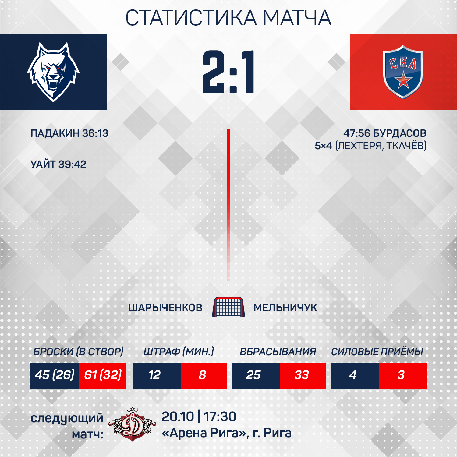 До 37-й минуты игры на табло горели цифры 0:0, но сам матч проходил невероятно интересно и в напряженной борьбе. Гости, конечно больше атаковали, но наша команда отвечала острыми контратаками и в одной из таких Павел Падакин, который играл первый поединок после восстановления от повреждения, поймал защитников СКА на ошибке и открыл счет. А на последней минуте периода Мэтт Уайт один прошел практически всю площадку и бросил точно в «девятку».В третьем периоде в большинстве гости все-таки одну шайбу отыграли, но большего «волки» им не позволили. 2:1 наша победа! Кстати, на своем льду «Нефтехимик» не побеждал СКА почти девять лет, но сегодня эта серия прервалась!