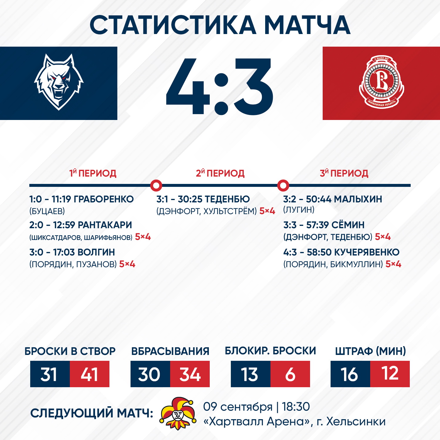 В стартовом периоде игра отлично давалась «волкам». Нижнекамцы дважды реализовали большинство и еще один гол был забит в равных составах. Отличились Роман Граборенко, Отсо Рантакари и Алексей Волгин. 3:0 после 20 минут.В оставшуюся часть поединка «Витязь» бросился в погоню и показалось, что она им удалась - 3:3 на 58 минуте встречи. Однако именно тут случилось еще одно удаление у соперника. Александр Кучерявенко шикарно сыграл на пятаке и забил победную шайбу! 4:3 - есть первые два очка в копилку нашей команды!