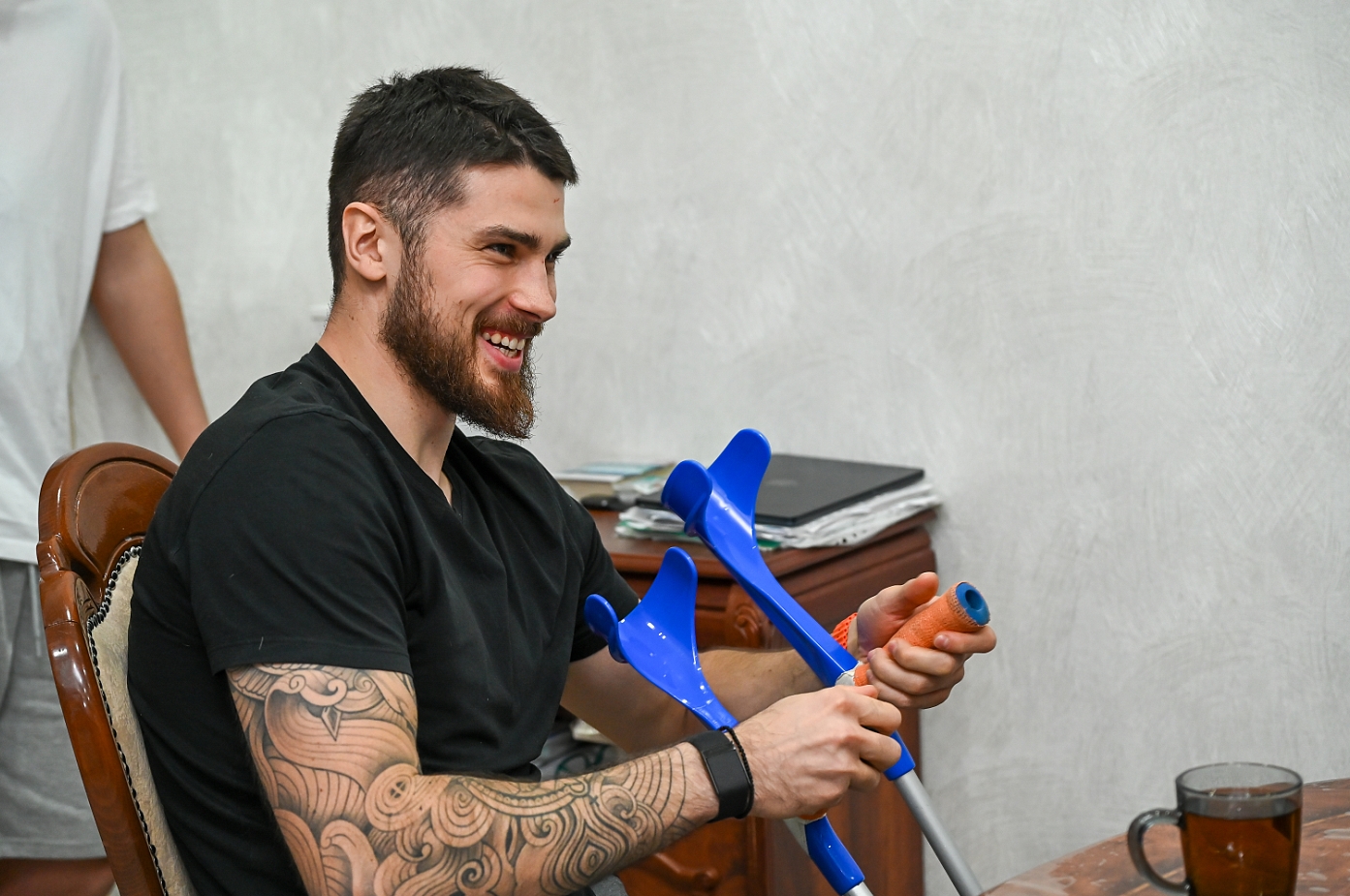 К теплой компании чуть позднее присоединился и Роман Абросимов, который доковылял на трех ногах. (Роман после операции проходит реабилитацию и пока передвигается с помощью костылей).