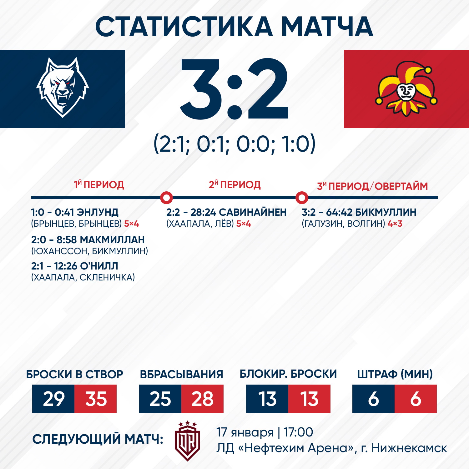 Для «волков» игра началась более чем удачно. Уже на 41 секунде Йонас Энлунд реализовал большинство, а спустя 8 минут Брэндон Макмиллан забросил шайбу и довел счет до 2:0. Этот бал за результативность стал сотым для канадца в КХЛ.Однако гости и не думали сдаваться. К середине встречи счет на табло уравнялся - 2:2. Наша команда играла с большим преимуществом всю вторую половину игры. В третьем периоде было упущено несколько шансов забросить голы, но всякий раз выручал голкипер гостей. Исход игры решился за 18 секунд до конца овертайма. Бикмуллин отличным кистевым броском принес «волкам» третью домашнюю победу кряду.