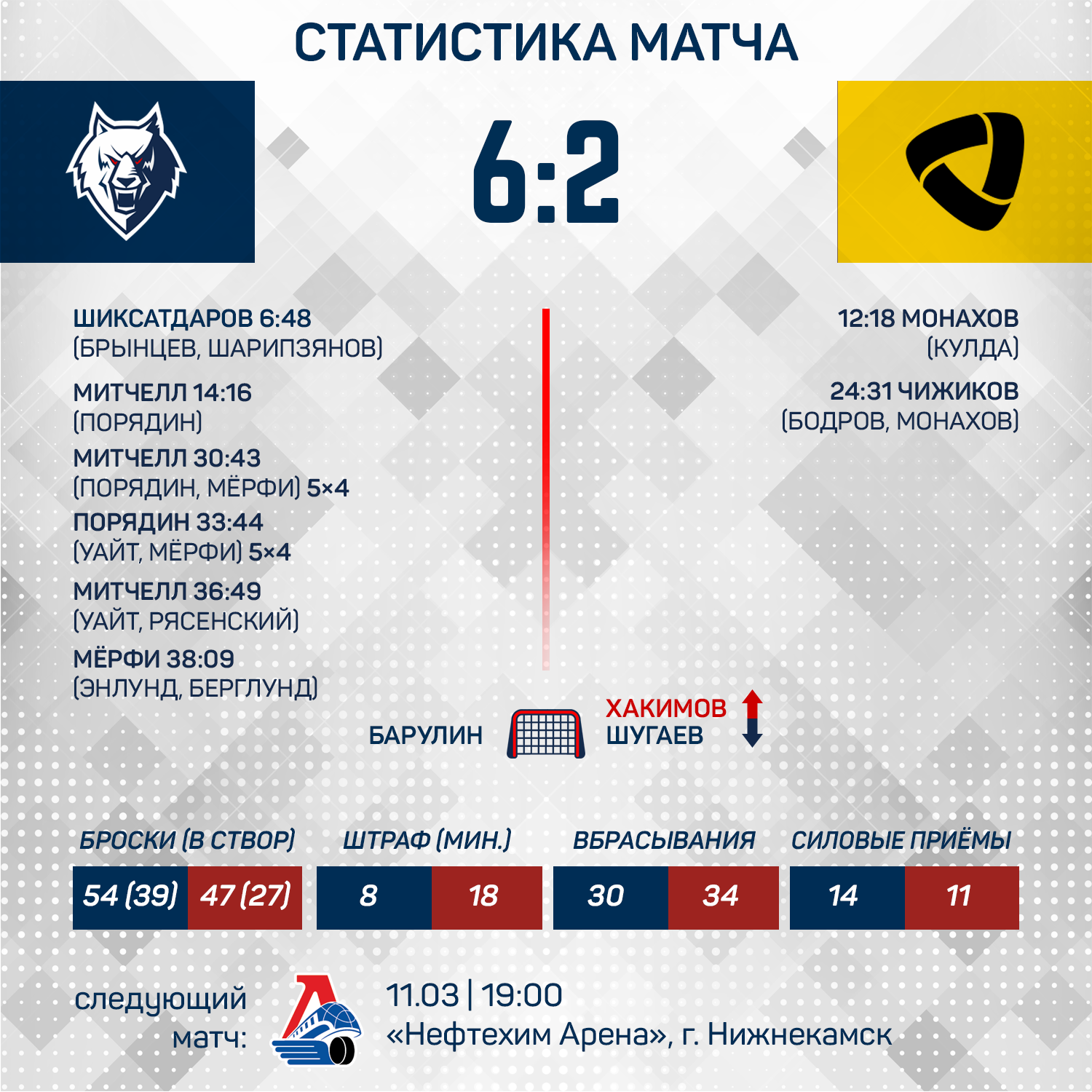 Ильдар Шиксатдаров открыл счет на седьмой минуте встречи, но соперник быстро отыгрался. Однако две минуты спустя, после того, как счет стал равным, Митчелл вывел «волков» вперед. 2:1 - с таким счетом завершился первый период.В дебюте второй двадцаминиминутки «Северсталь» снова сделала счет равным, но затем забивали только нижнекамцы. Павел Порядин, Райан Мерфи и дважды Митчелл довели счет до крупного. В третьем периоде цифры на табло не изменились. 6:2 - отличный старт в домашней серии!