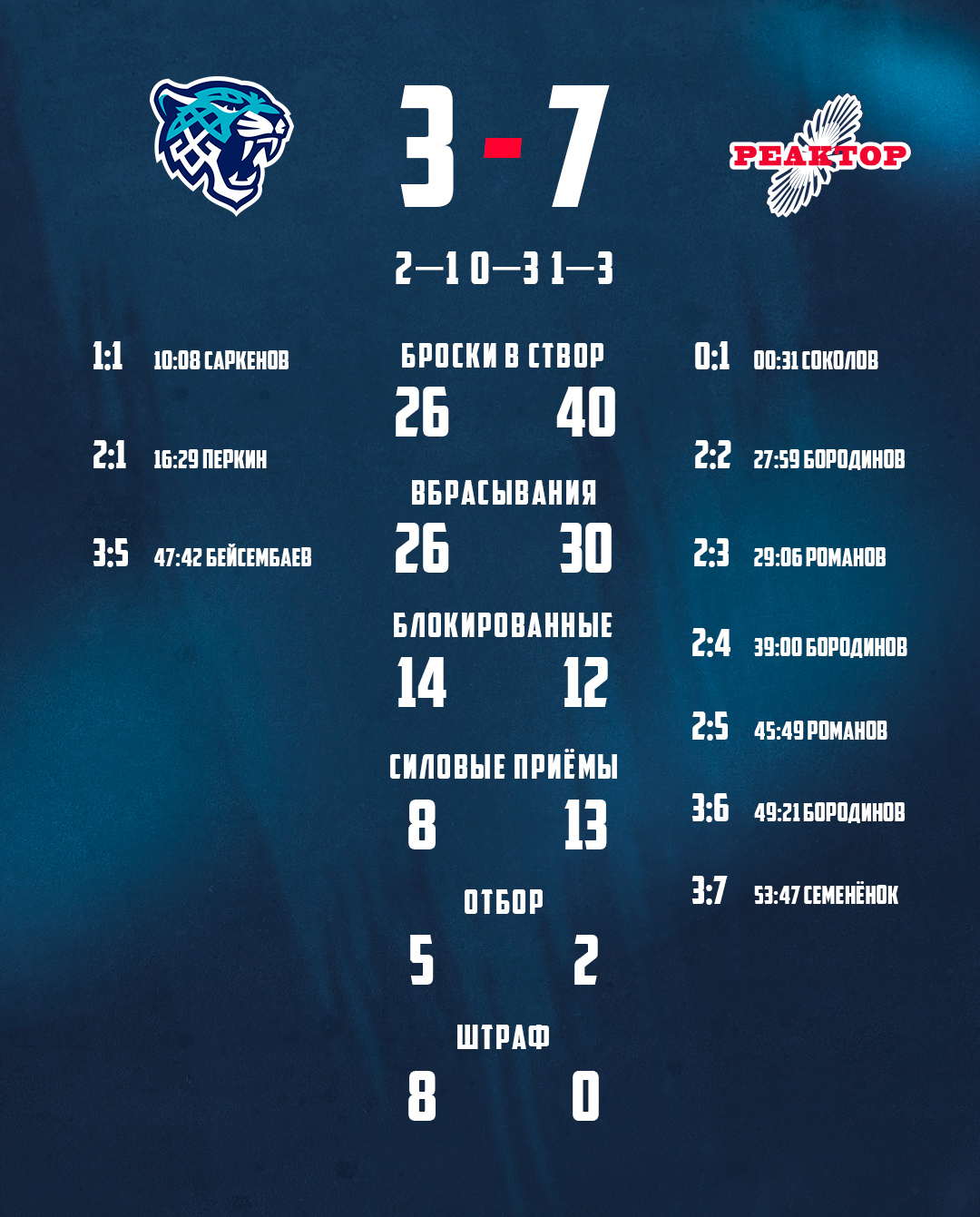 В первом периоде на первой минуте Севастьян Соколов открыл счет, но до первого перерыва хозяева смогли отыграться и выйти вперед.Во втором периоде «Реактор» полностью перевернул игру. Дубль Игоря Бородинова и шайба Давида Романов сделали отличный задел перед третьим периодом, а там нижнекамцы продолжали забивать. Бородинов оформил хет-трик, Романов – дубль. Еще один гол забил Дмитрий Семенёнок. 7:3 – важная победа на конкурентом в борьбе за плей-ин.