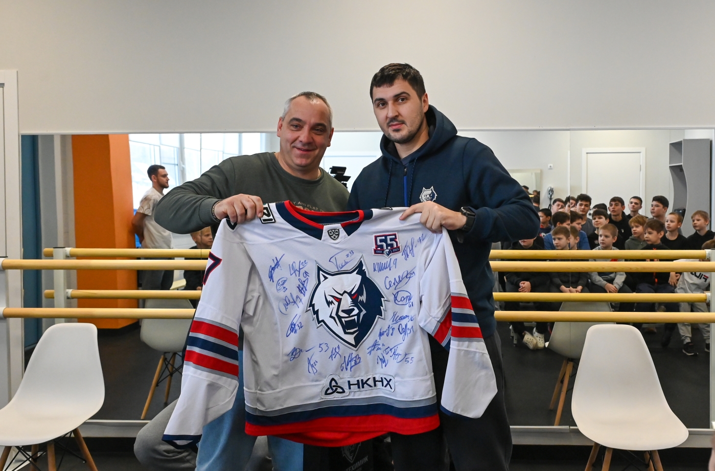 Кроме того «волки» провели импровизированную пресс-конференцию, а также подарили директору школы Владимиру Алексеевичу Егорову свитер «Нефтехимика» с автографами всех игроков.